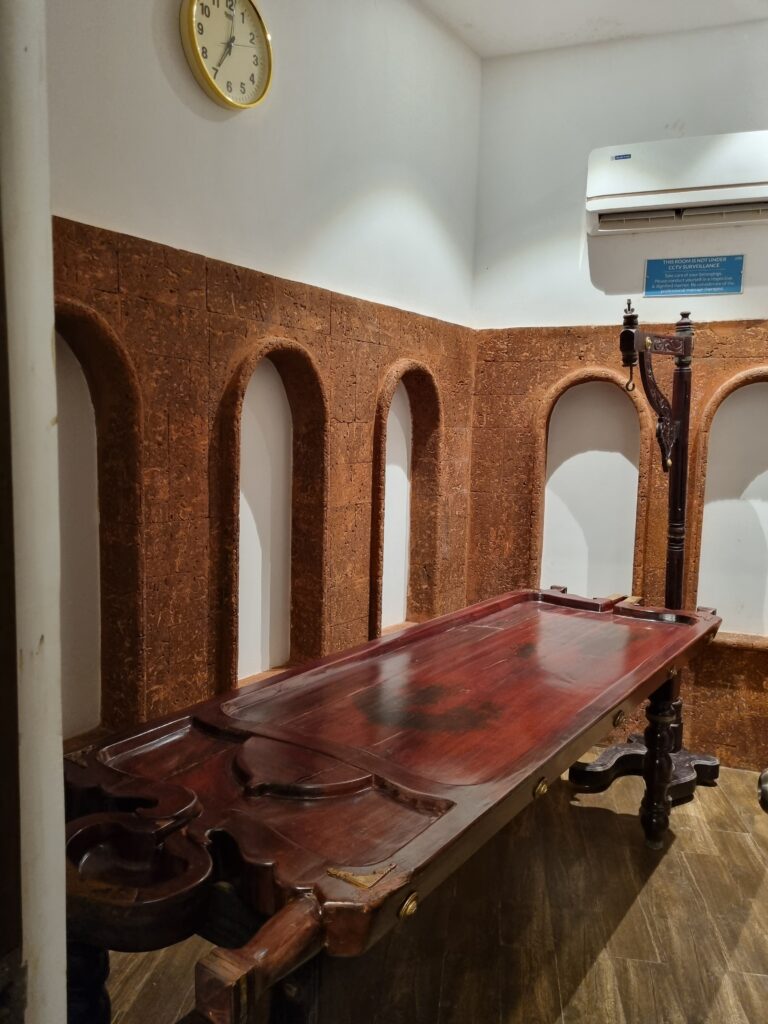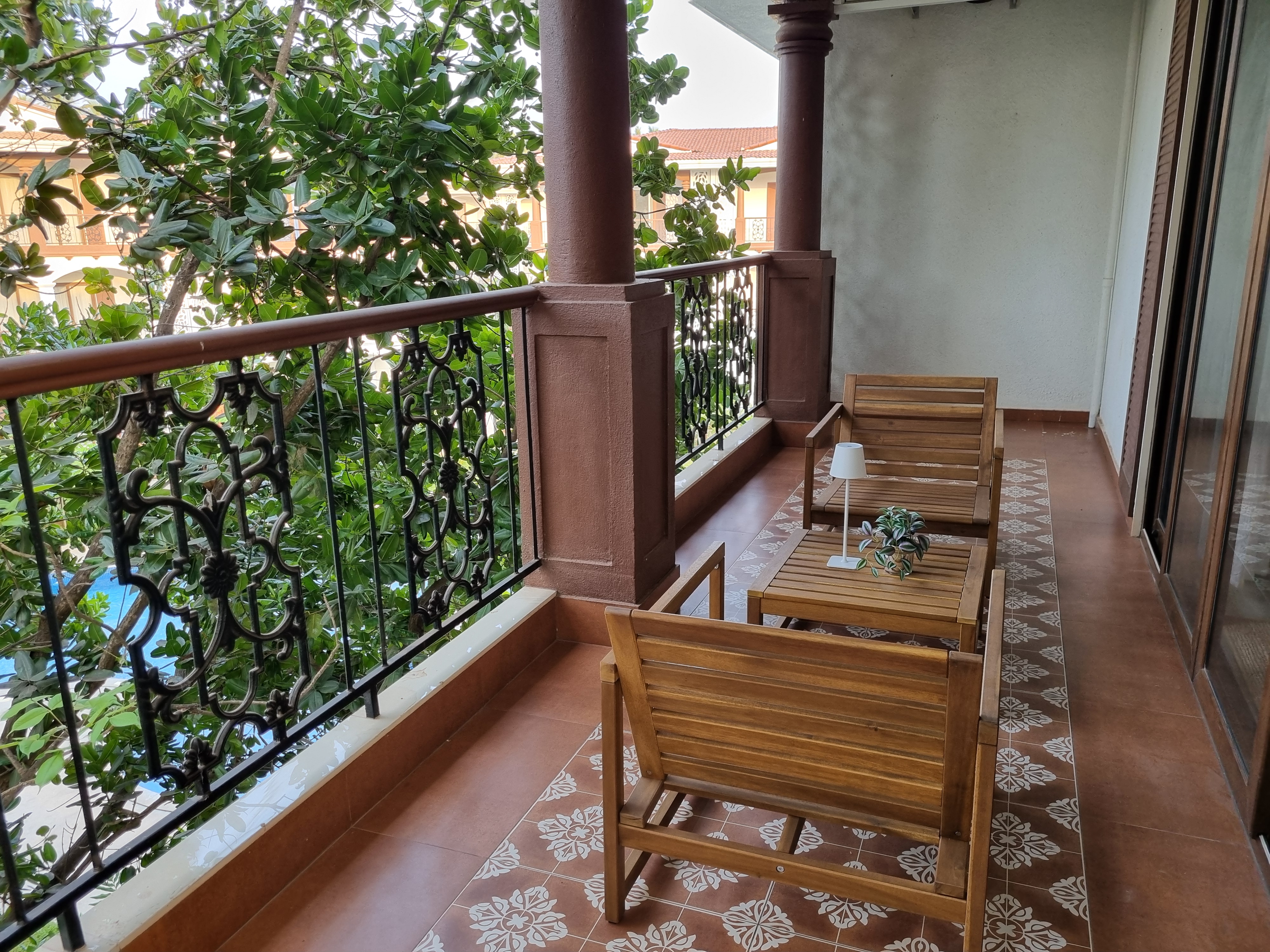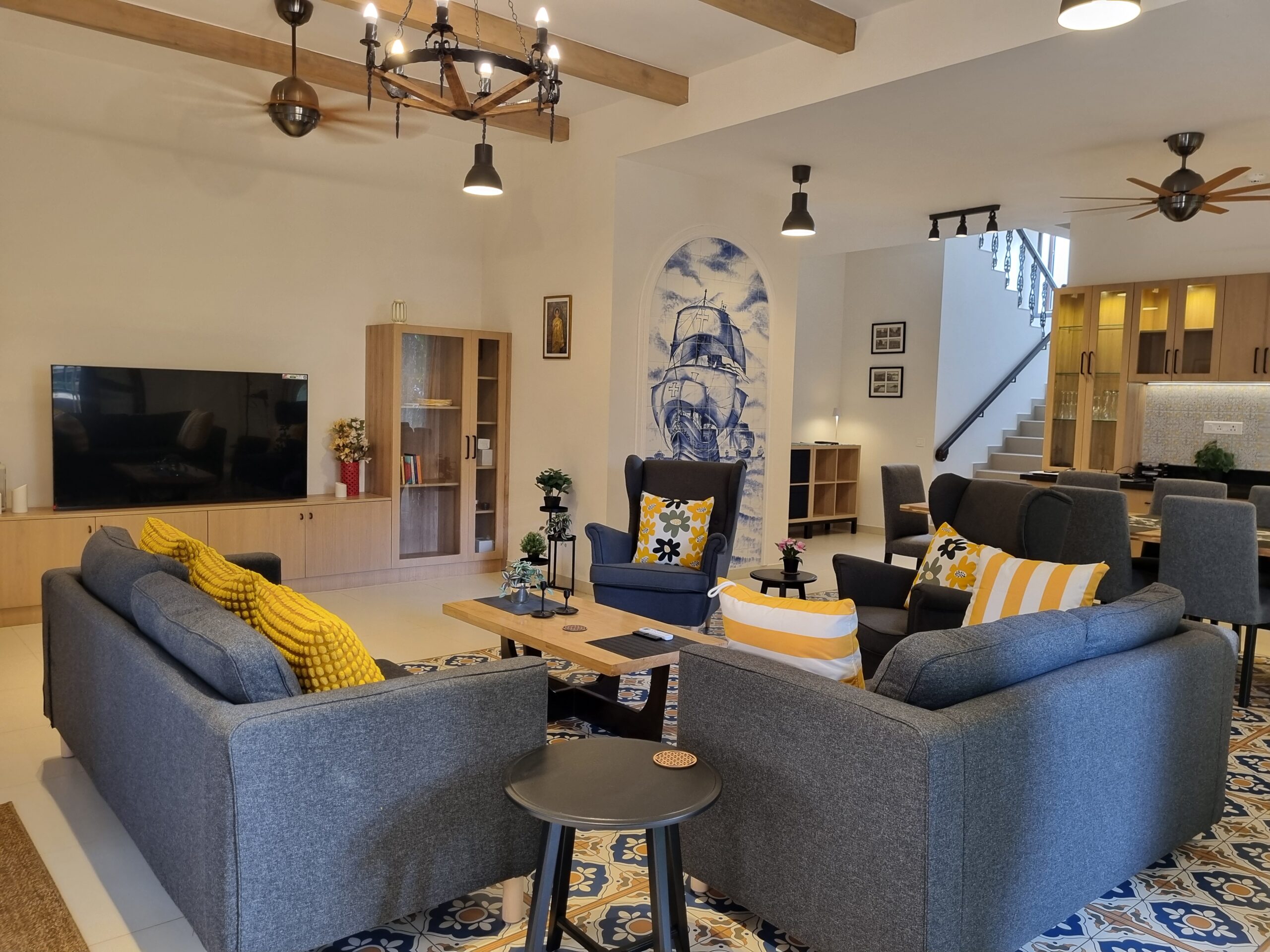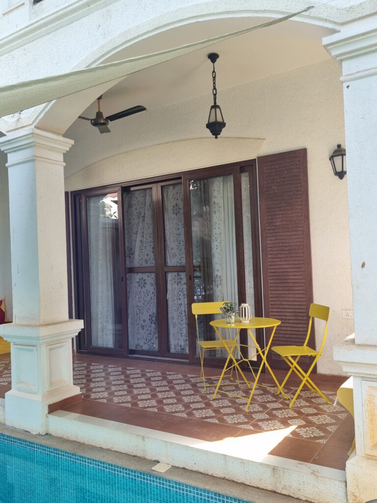 The living room has a country house theme with oak and black colors. With rafters on the ceiling, and bright colored Portuguese themed tiles on the floor, the living room has a warm feeling. Both sofas and arm chairs add to the feeling of comfort. One of the sofas can be converted into a queen bed allowing for cozy movie nights on the 65 inch television screen. The living room opens onto a patio and a plunge pool; an true to the Goan charm has a bright colored Balcao on both sides.