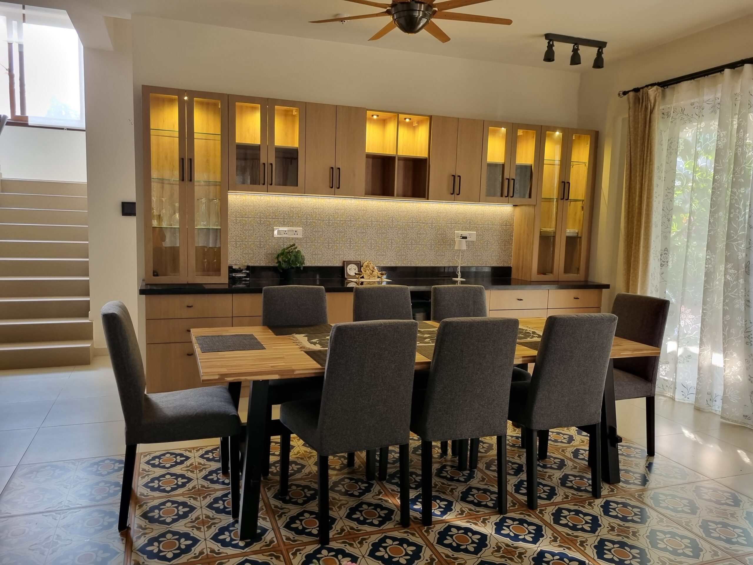The dining space has a Acacia wooden top 8 seater dining table; with a bar unit and loads of serving and storage spaces to host a party. The bar area comes equipped with a wine cooler. The dining space opens into a dining patio area in the garden with seating space.