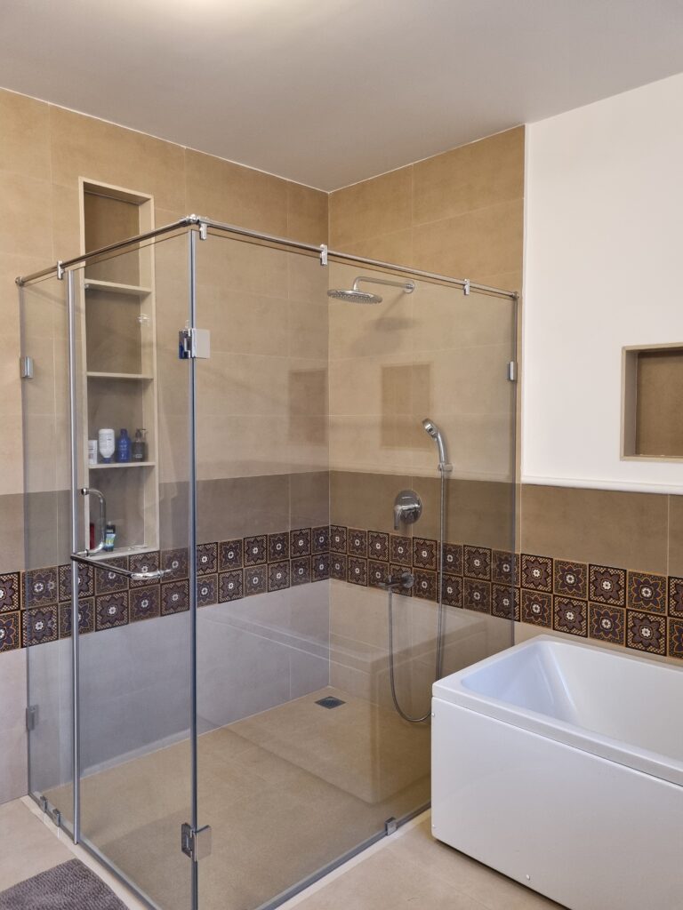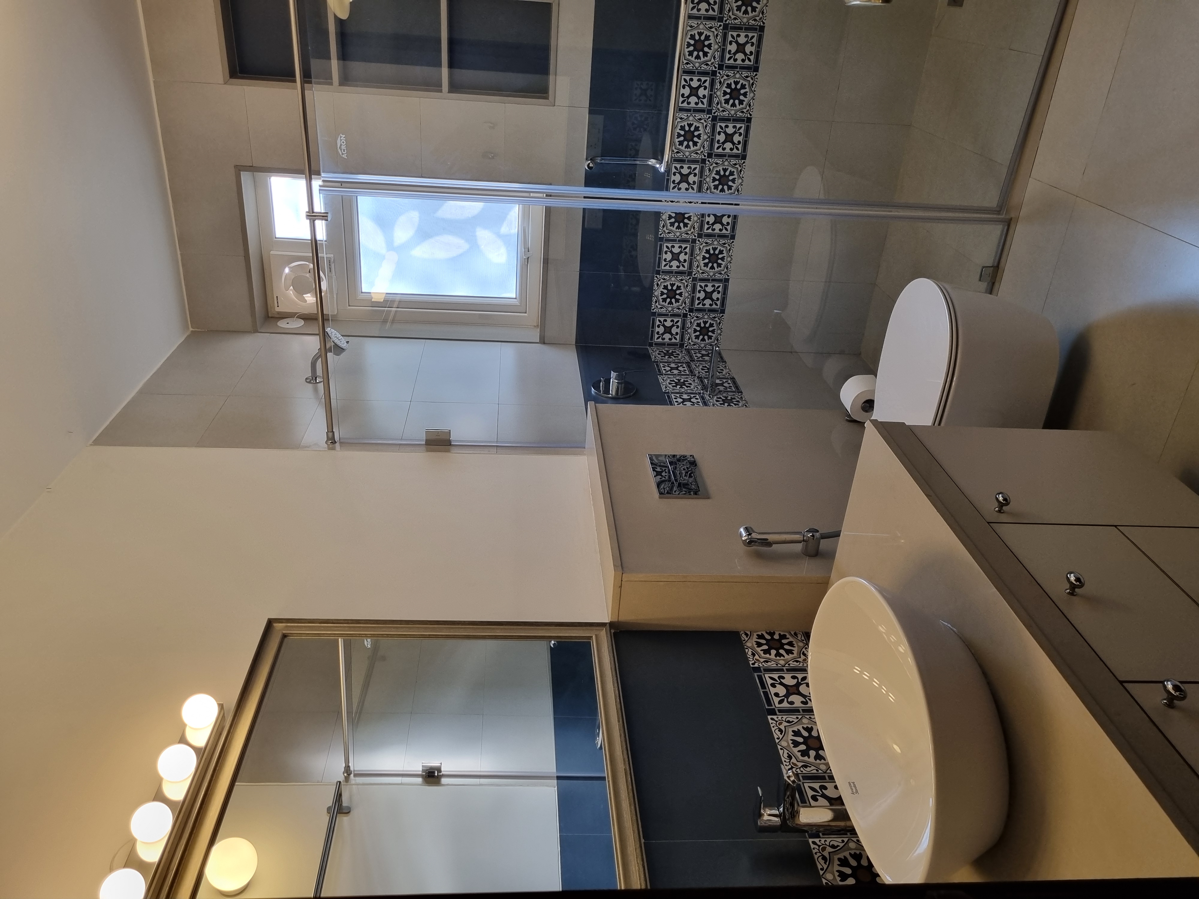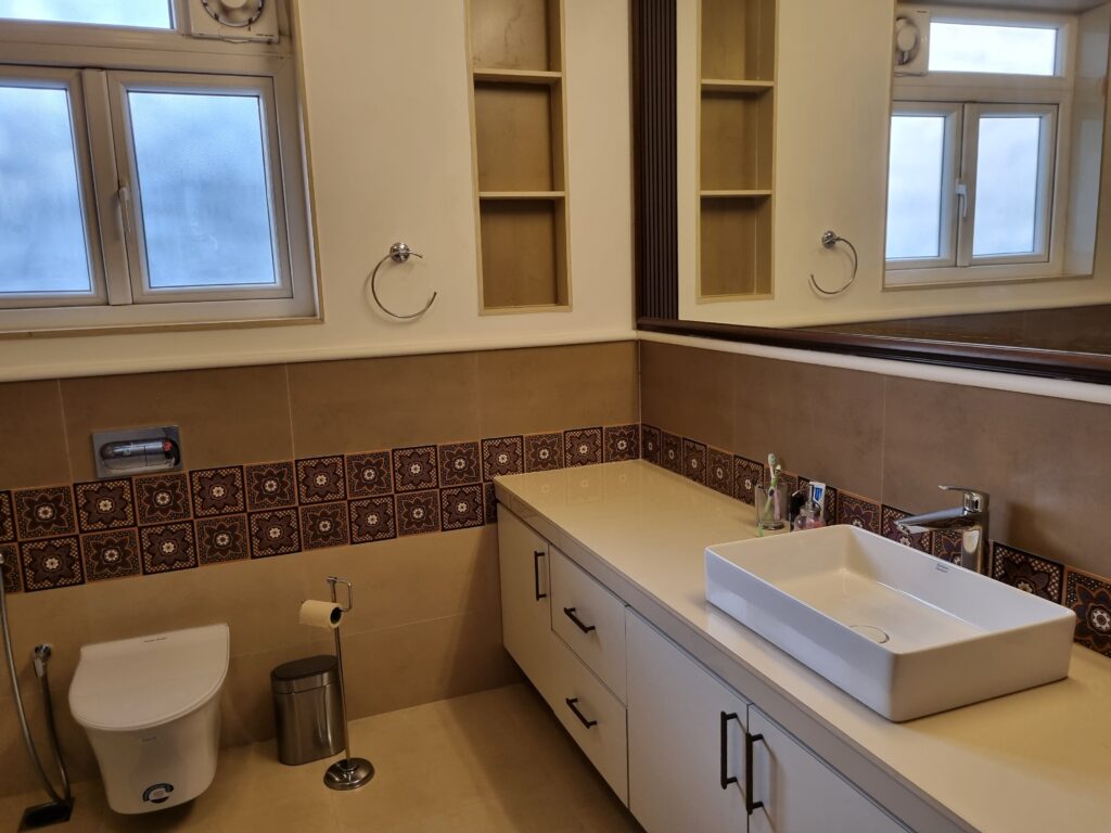 All the bed rooms have ensuite bathrooms and the villa has two additional powder rooms. The master bedroom on the second floor has a luxurious bathroom with a bathtub and shower cubicle and wall to wall mirrors. The bedrooms on the first floor have large bathrooms with rain showers. There is a powder room on the ground floor as well as one next to the terrace for guests. All bathrooms are equipped with ample storage for linen and toiletries.