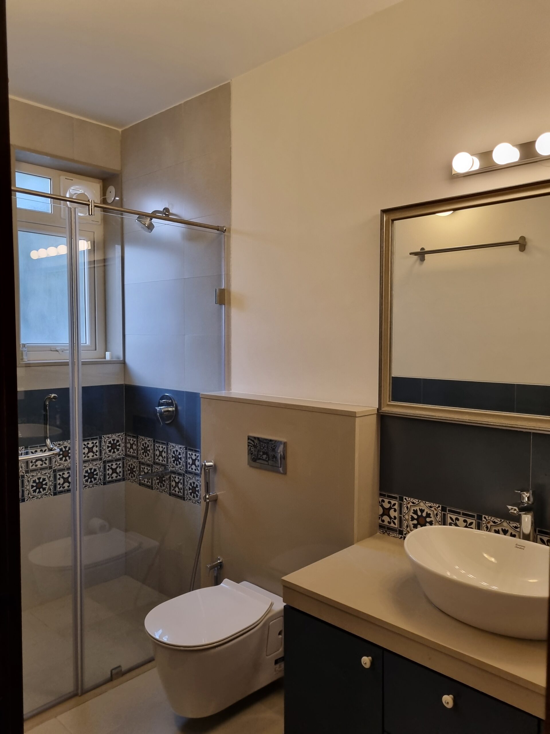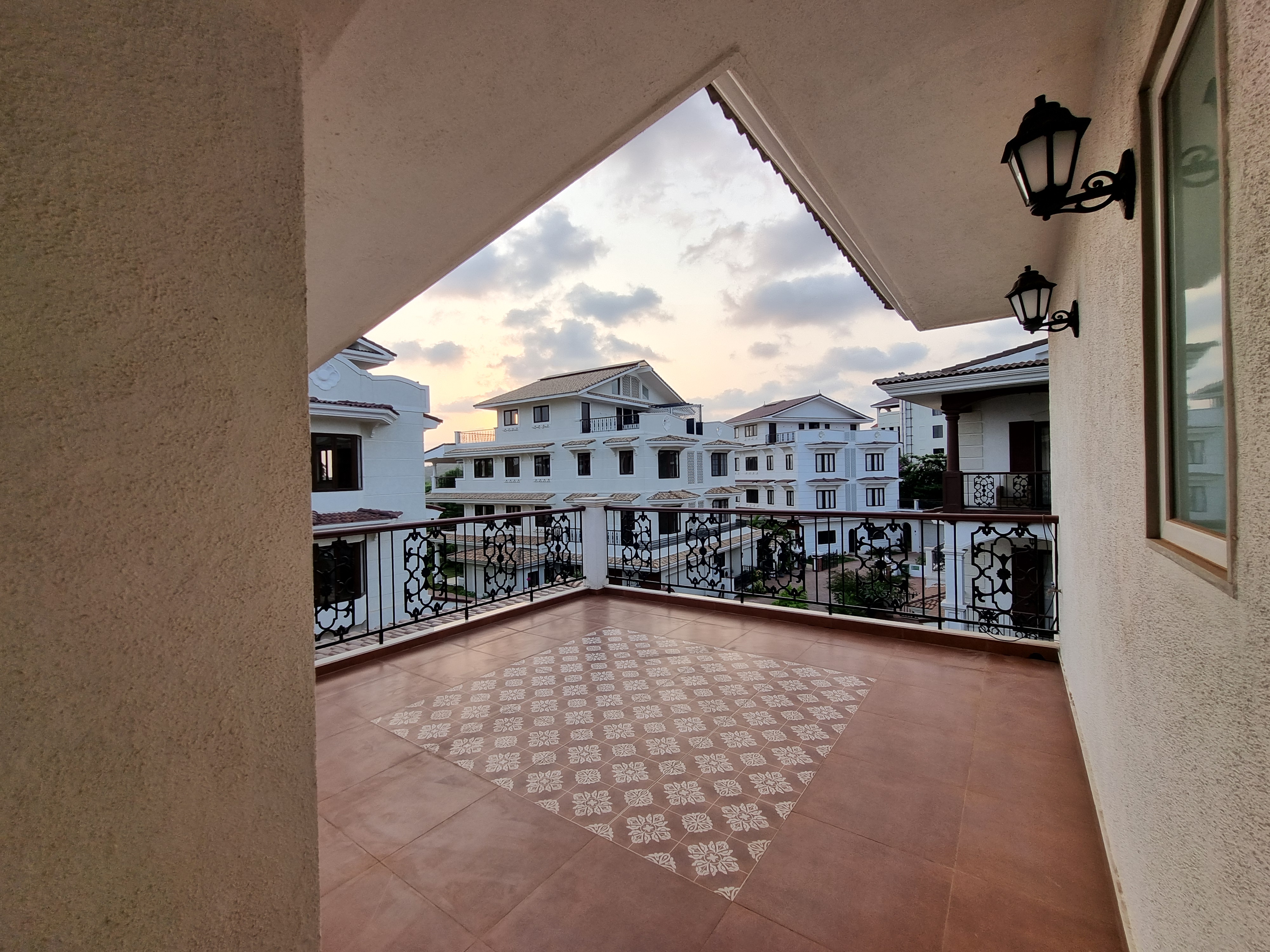 The villa has 3 bedrooms, 2 large master bedrooms on level 1 and level 2 respectively and a large bedroom on level 1. Each bedroom is tastefully designed in Goan colors combining traditional and modern elements. The large master bedroom on level 1 has a blue theme with oak finished furniture, a large king size bed with storage as well as a sofa that can convert to a queen bed, in front of the television. The room also has a full sized study table, in case work interrupts your vacation or if work and vacation go hand in hand for you. The room opens onto a large balcony shaded by large fully grown trees. This level also has a large bedroom with a brick red and grey theme, a bay window seating allows for a cozy reading or day dreaming nook, overlooking the creek. This bedroom opens onto a sun deck with an outdoor and chairs to enjoy the sun set over the creek. On level 2, is the second large master bedroom, designed in shades of yellow and orange with walnut wood finishes and a high ceiling adorned with rafters. The turned wood Goan designed furniture add a traditional charm to the room. This room is also equipped with a large sofa, TV unit as well as a full fledged study area and storage spaces. This bedroom opens onto a large balcony, shaded with trees and a view to the central swimming pool of the community. All the bedrooms have ensuite bathrooms, more of it in the next section.